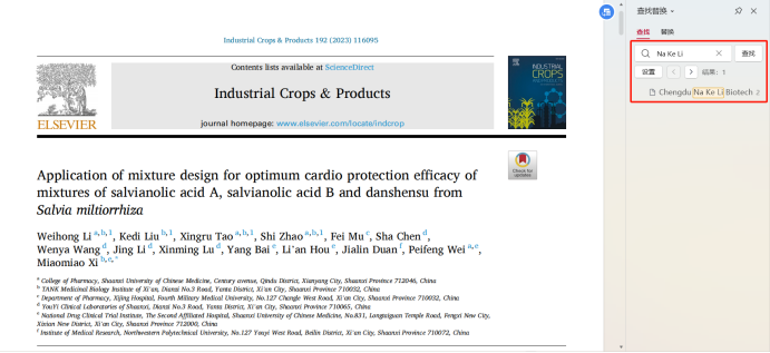 我公司為陜西中醫(yī)藥大學(xué)定制丹參總酚酸、HPLC≥90%用于試驗(yàn)研究,該項(xiàng)目發(fā)表的題目為《Application of mixture design for optimum cardio protection efficacy of mixtures of salvianolic acid A, salvianolic acid B and danshensu from Salvia miltiorrhiza》文章已被Industrial Crops & Products 192 (2023) 116095 期刊收錄;我們會(huì)繼續(xù)努力,為您的實(shí)驗(yàn)保駕護(hù)航;最后感謝各位老師對(duì)鈉鈳鋰生物的信任和支持??!